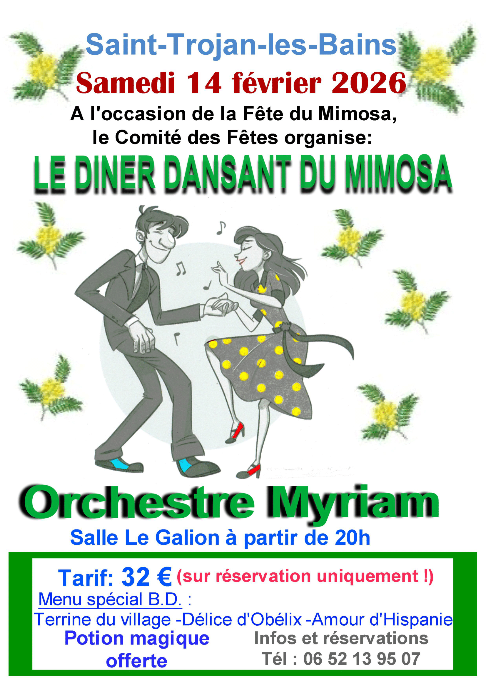 Samedi 14 février 2026, l'équipe du comité des fêtes de St Trojan les Bains vous invite à participer au dîner-dansant organisé à l'occasion de la fête du mimosa 2026.